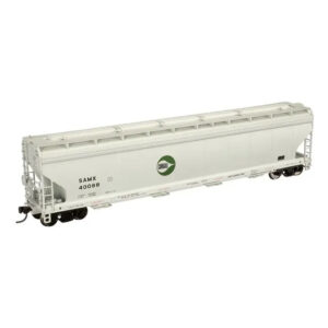 American Car and Foundry (ACF) introduced the 5748-cubic-foot covered hopper in 1972. This model belongs to the “Center Flow” family of railcars. Unlike older hoppers, the Center Flow design lacks a heavy center sill. This allows ACF to place discharge outlets along the center of the car for more efficient unloading. The 5748 specifically evolved from the earlier 5701 model and features four distinct bays to hold massive amounts of dry bulk cargo.