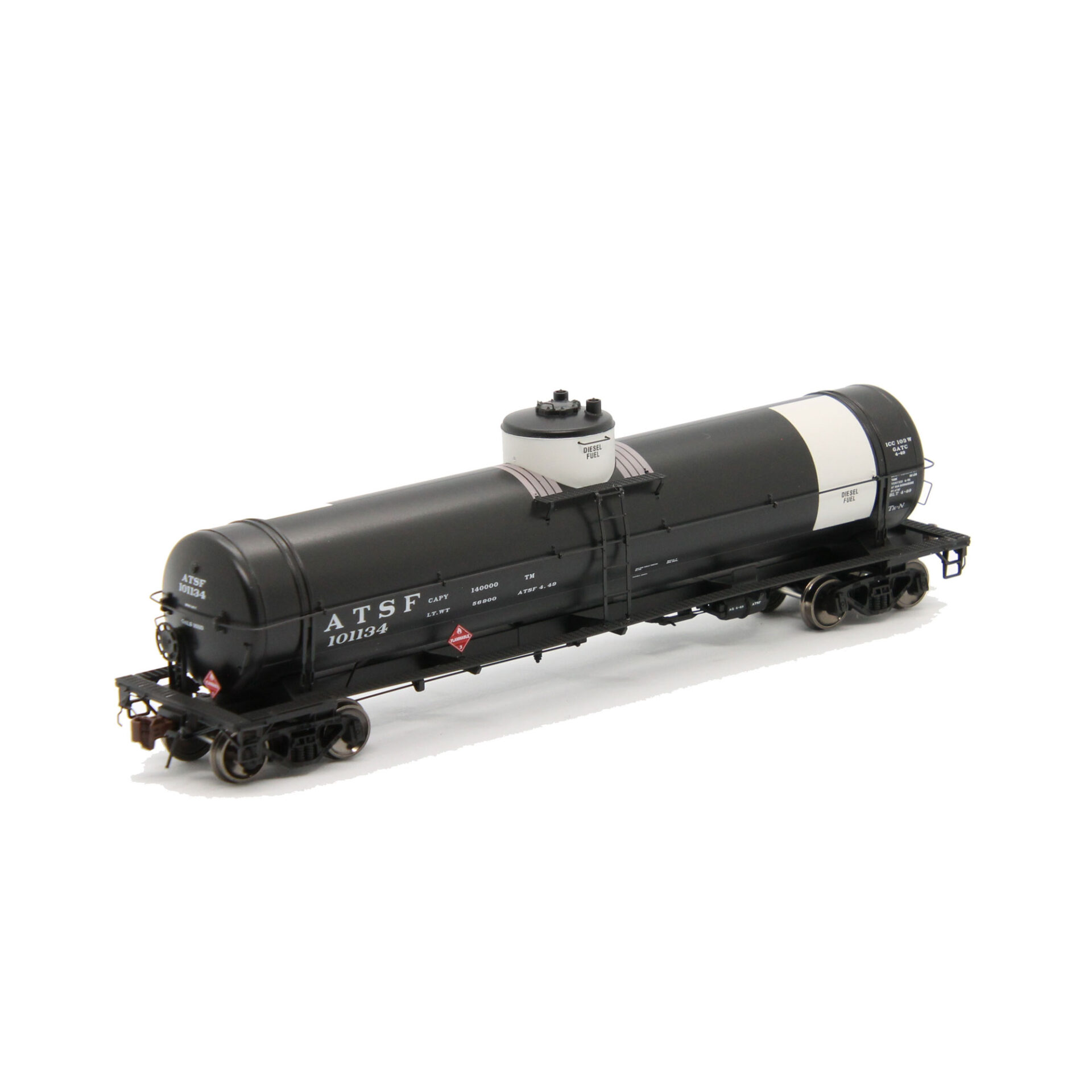 The Santa Fe instituted a color-coding system to delineate the tank car’s lading. As such these tank cars wore colorful paint schemes with colored coded end bands and dome bands to clearly indicate specific use.