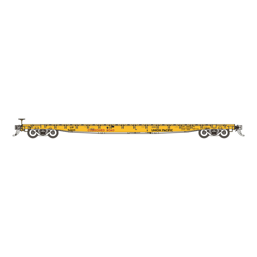 The 60′ General Steel Castings (GSC) flatcar is a car of tremendous versatility. The General Steel Castings (GSC) 60’ flatcar served nationwide in service on many railroads starting in 1956. They were used in lumber, wallboard, poles, and heavy equipment services, to name a few. These flatcars were often photographed hauling “wrecked” cars, and many still operate today in various company service roles. GSC, located in Granite City IL, supplied either complete cars or cast steel flatcar bodies to various railroads. Railroads that elected to purchase only the bodies would then equip the cars with components preferred for projected service.