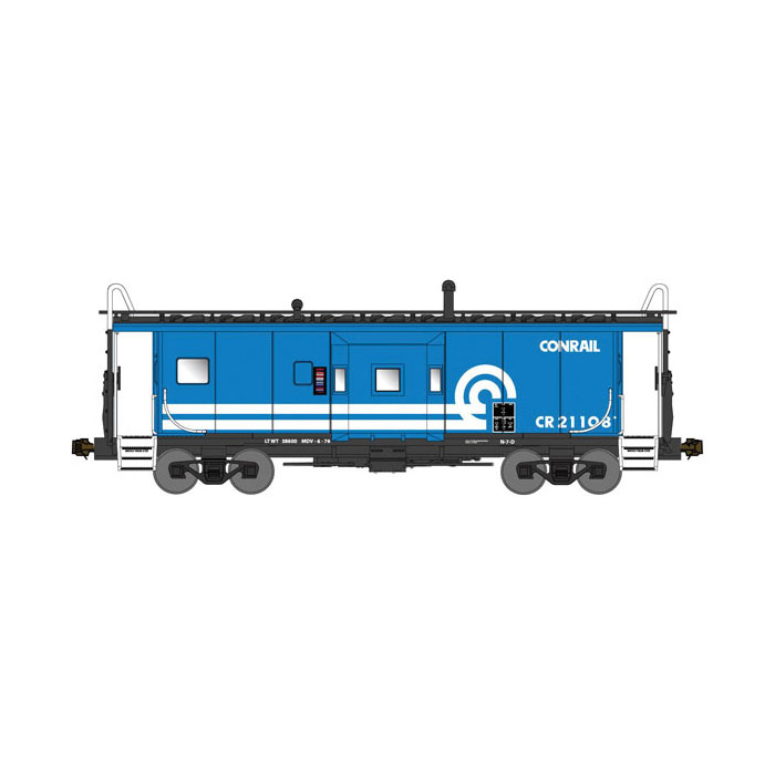 This pair of Conrail Phase I cabooses was built for the Erie, joining the Conrail fleet by way of Erie Lackawanna and receiving the large version of the Conrail “can-opener” logo shortly after their April, 1976 launch. Later, cooler heads would prevail and a smaller can-opener that fit entirely to the left of the bay window was adopted. Those early months were a time for high hopes and big statements.