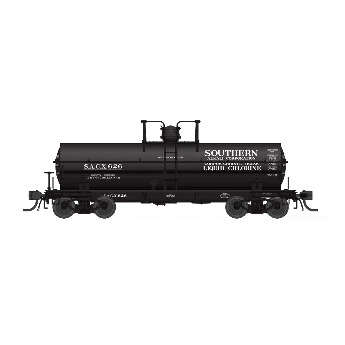 We are pleased to deliver the Type 27 tank car which is the slightly elongated younger sibling of the Type 21 tank car. These insulated high pressure cars were used often in the transport of the home heating fuels propane and butane as well as anhydrous ammonia, chlorine, and methyl chloride. We are modeling the 6000 gallon car that often hauled liquid chlorine.