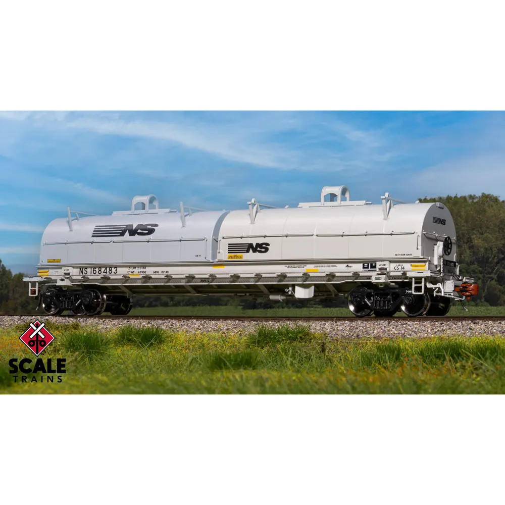 - Factory-applied end handrails, hood guides, stanchions, load divider tracks, metal grab irons, coupler cut levers, and trainline hoses with silver gladhands