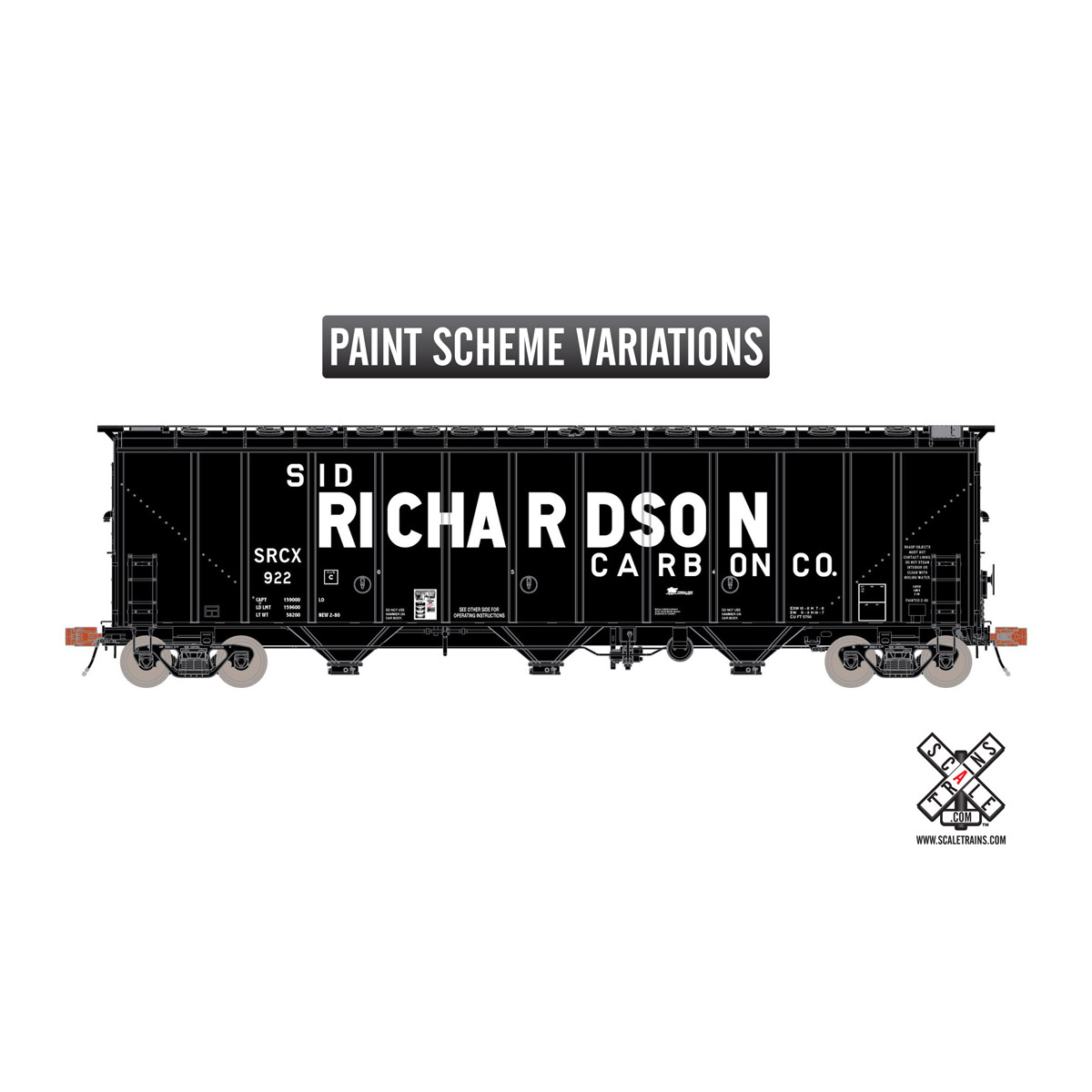 During the 1970s, Thrall Manufacturing Co. introduced a new railcar designed for handling carbon black. These 3-bay, 70-ton capacity covered hopper cars boasted a volume of 5750 cubic feet, and measured 51’ over their ends. Unlike traditional covered hopper designs, where the end slope sheets are plainly visible, these cars featured an enclosed, boxy design, which was a necessity due to a special design feature to aid in the unloading of carbon black.