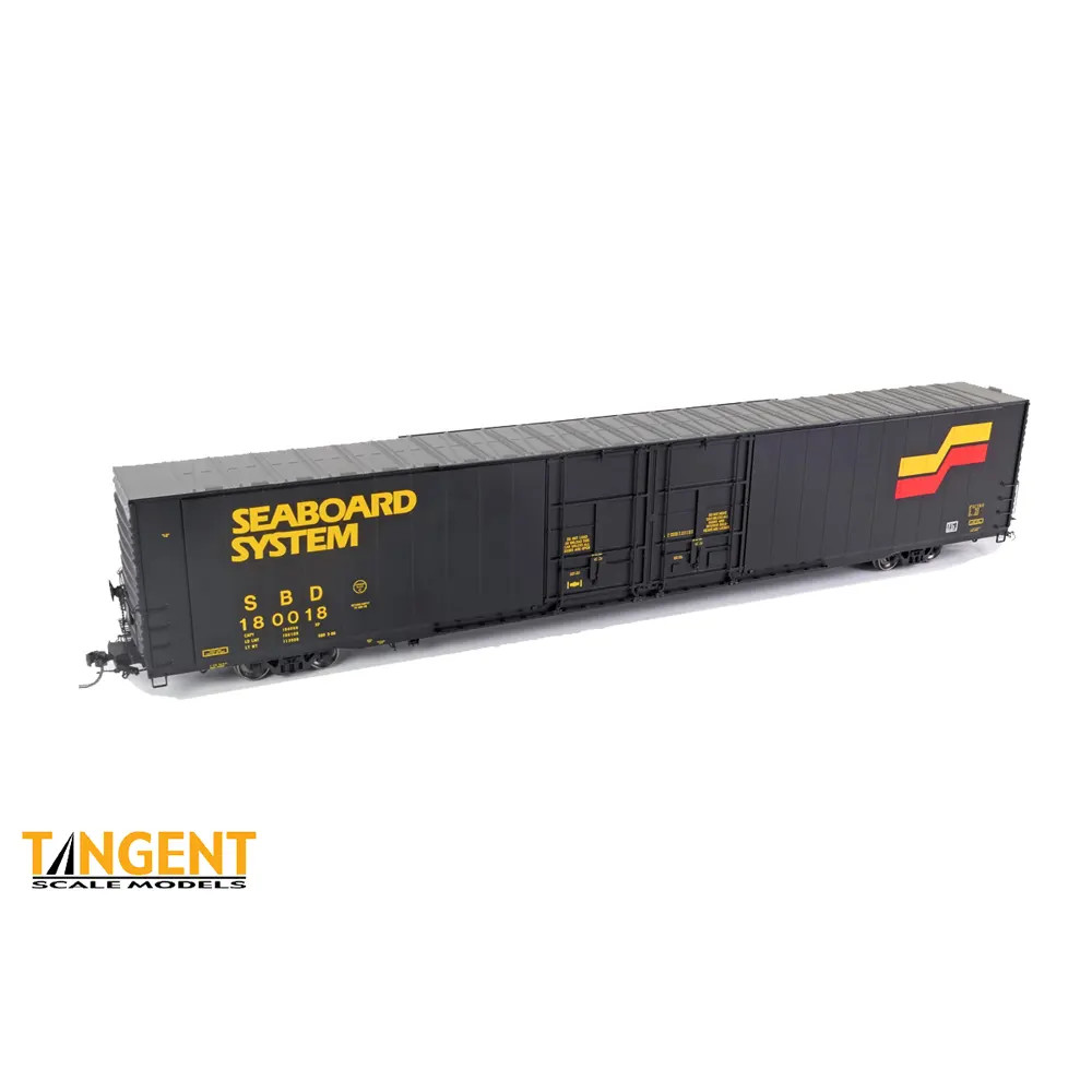 Seaboard System (SBD) “1986 Repaint” is a nod to the classic 1980s and the new corporate image of the combined SCL and L&N railroads. Formed in 1982, the Seaboard System would go on to officially acquire the remaining Family Lines railroads and Chessie System Railroads by 1987 and become CSX Transportation. The Tangent model mimics cars from L&N’s first order of cars in 1964. While the L&N cars were originally built with high ladders and running boards, these features were quickly changed on the prototype cars. This Tangent model duplicates this 1965+ look: the prototype’s running board was removed; the end appliances were completely rebuilt with a lowered brake wheel and new “L” grab irons and full-width crossover platforms. This Tangent model carefully replicates all these features with this 1965+ body, including the bolt remnants where all of that “high” equipment was attached. This includes the body side, showing off the high grab iron remnants in the top-right corners. These cars were repainted at the former L&N South Louisville Shops in Kentucky and feature the big-bold Seaboard System logo, perfect for 1986. The ends of the car are painted silver at the tops of the excess height area. Underneath. The model features an accurate Center-of-Car Cushioning underframe with truck-mounted brake hardware, “lowered” Miner hand brake, 1965 replacement full-width Apex crossover platforms, 70T trucks with 33” wheels and rotating “Hyatt” roller bearing caps. This has been a heavily requested scheme.