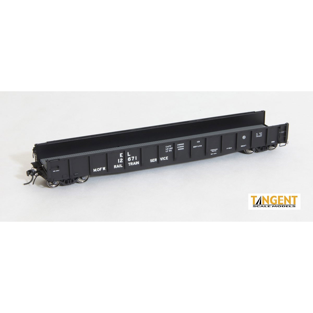 Erie Lackawanna “Rail Train” 1964+ in black paint for rail train service. The end doors are missing from these cars for rail loading – just like the prototypes – and the cars are labeled for rail service like the prototypes. These unique cars are available in 2 numbers, and offered unnumbered cars with a decal set available separately tailored for use with these cars so you can number the cars individually. Build yourself a unique and prototypical rail train with Tangent EL rail train cars!