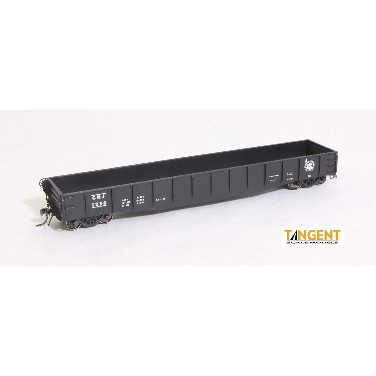 Central Railroad of New Jersey (CNJ) in the 1944 paint scheme as CRP but with a 1952 reweigh date. Like the CRP replicas, it includes the white stencils including “Lady Liberty” and “Jersey Central Lines” on a black carbody.