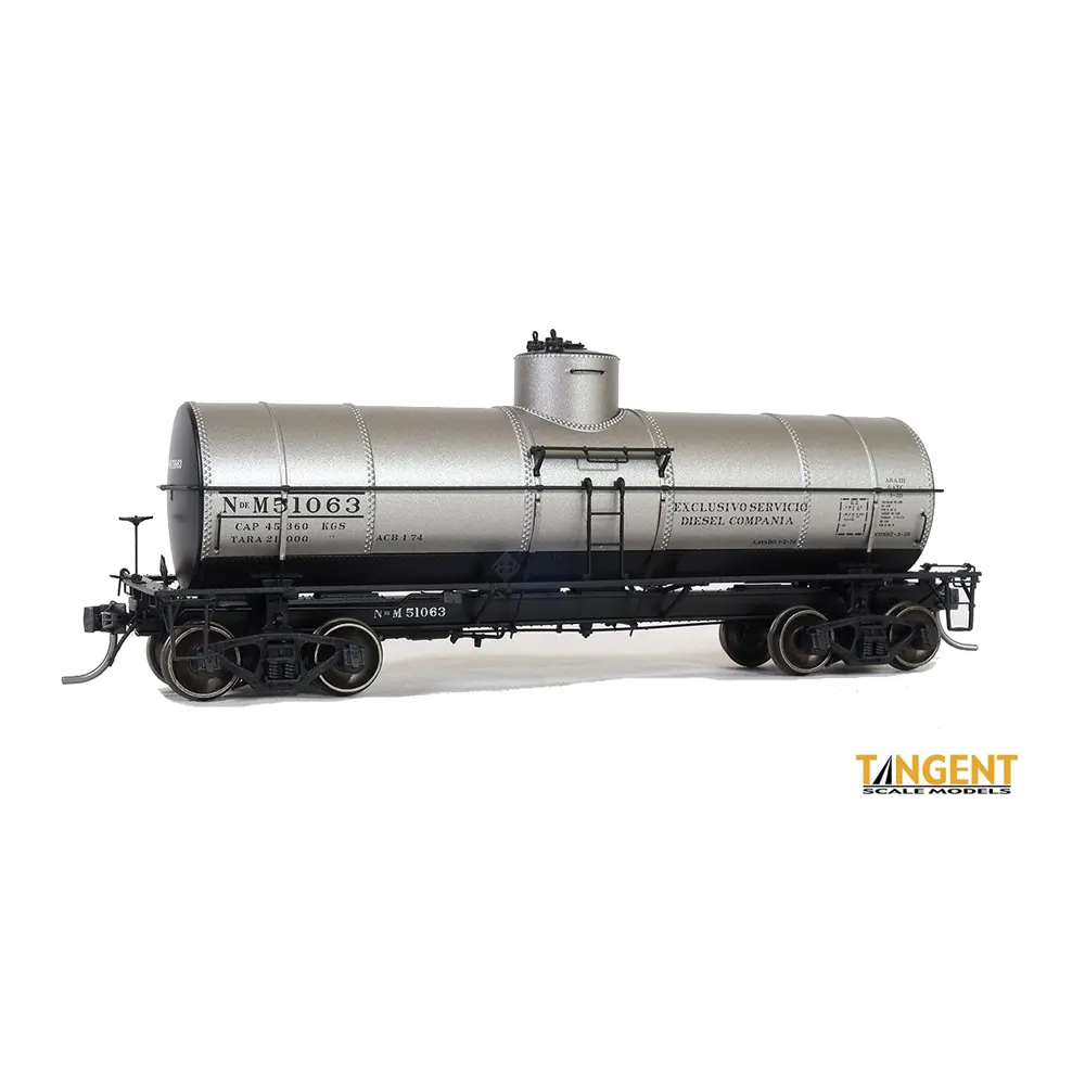 NdeM “MOW Silver” 1974+ is a railroad-repainted MoW tank car.  The “Nacionales de Mexico” railroad repainted this tank car into a distinctive silver paint scheme with black ends.  The car has large “Exclusivo Servicio Diesel Compania” stenciling on the side, indicating usage for diesel fuel service.  Need to fuel those GP38s!  Amazingly, this car retained its K-brake system.  We offer this car in one exactly accurate road number.