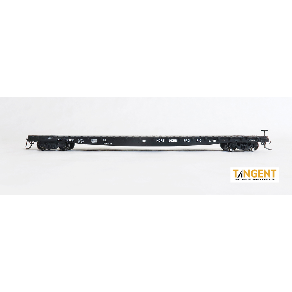 Northern Pacific (NP) “Original Black 1962” is an all new paint scheme for the Tangent GSI flatcar. Built at the NP’s Laurel Shops and painted black, the distinctive white NP-style lettering stands out on this car. Check out the little details like A and B notation on the ends of the car.
