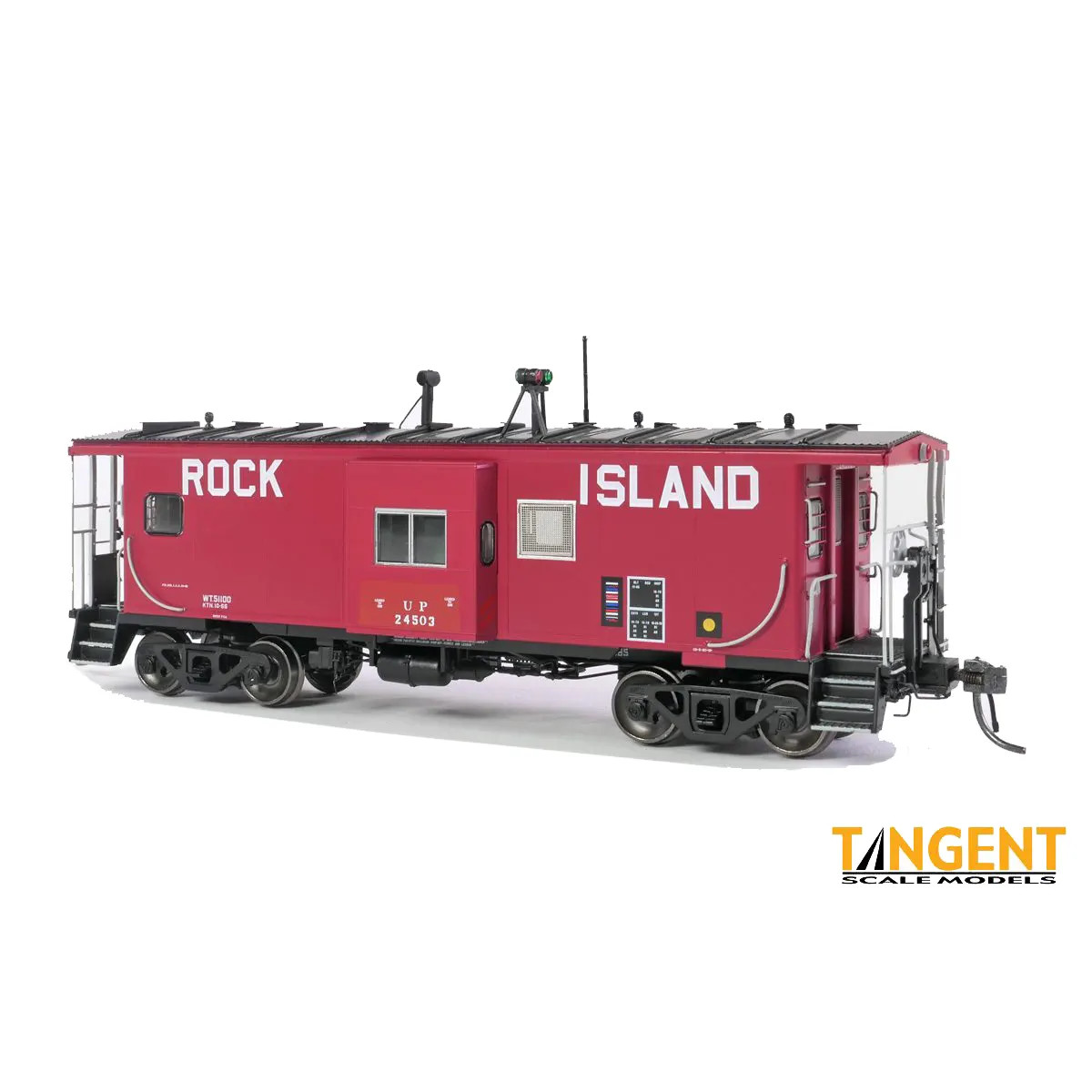 UP Chicago & North Western (CNW) Lease 1980+ w/Red-Green Lights and FRA Red Light replicates a pair of interesting lease examples of ex-RI equipment. In 1980, the C&NW took control of significant ex-RI track miles in Iowa/Minnesota and was also planning the rebuild of its own caboose fleet. The C&NW needed road cabooses fast. The UP leased several dozen ex-RI ICC Bay Window cabooses to the C&NW through 1981. These cabooses can be identified by tiny 1” “LEASED TO CNW” stenciling on the body or bay window, but retained their UP bandit paint jobs. When returned in 1981, the cabooses continued to serve the UP with intact CNW stenciling.