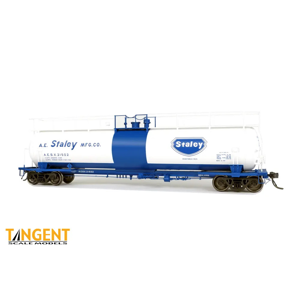 AESX “AE Staley Manufacturing Company Delivery 1963” leads off in a shipper-designed bright white and blue paint scheme with the classic Staley logo, including the words “Vegetable Oils.” The left side of the car includes the classic 1960s A.E. Staley Manufacturing Company stenciling, effectively advertising the company’s brand and product. Check out this model’s distinctive color separations: white carbody, blue underframe, and blue tank band. Additionally, you will see the reporting mark, road numbers, and NACC-standard serial number applied to the super-detailed underframe. These tank cars roll on Tangent 100-ton Barber S-2 trucks with 36’ wheels, separate truck brake beams and rotating Timken roller bearing caps.