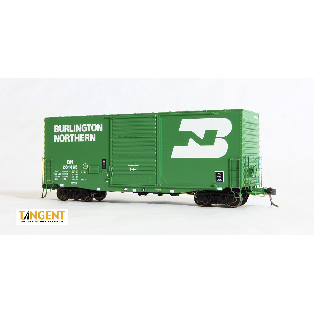 BN “Cascade Green 1973” continues Tangent’s BN repaint series started last year. This BN repaint variant from February 1973 is applied to a former CBQ car. This car has a stunning repaint with a large BN logo painted high on the car side, “Exceeds Plate C” logo, ACI label, and other standard BN touches like white delineators (yesterday’s “conspicuity stripes”). Check out the stellar BN green! At some point during the 1980s, BN began to shift some of these cars from appliance service to paper service. Don’t miss out! This cool repaint scheme is available with road number 281465 in order to accurately reproduce the prototype car