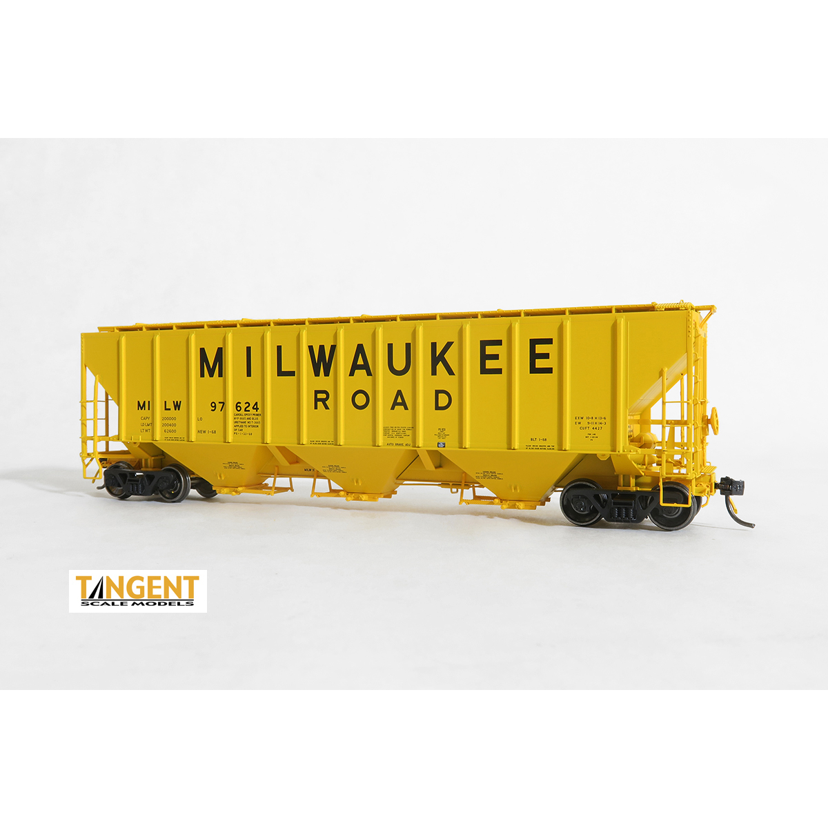 Milwaukee Road “Original 1-68” in as-delivered yellow with the large, spelled out Milwaukee Road painted by Pullman-Standard in 1968. These cars predate the “America’s Resourceful Railroad” placarded cars, yet are very statistically-relevant with more than 500 cars on the roster. Additionally, the models are correctly painted in federal yellow, not gray nor orange! Another cool feature of the Milwaukee 4427 can be found with the outlet gates. This specific series of Milwaukee cars were delivered with gravity-pneumatic outlet gates – for use in grain or malt service.