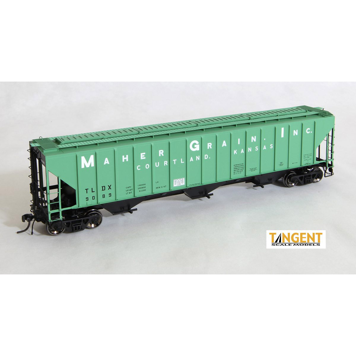 TLDX “Maher, Courtland KS Original 1967” in the original light “federal standard” green and black scheme, with white lease stenciling. This is Tangent’s first state of Kansas lease car to be offered and it is available in two road numbers. Courtland was served by both the Rock Island and the ATSF, and in the 1980s these cars were turned into generic lease fleet cars.