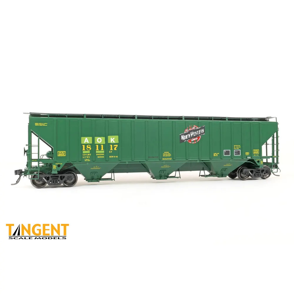 AOK “ex-CNW Restencil” 2006+ continues our tradition of gorgeous modern paint patches and restencils. These ex-C&NW cars are examples whose car lease was not renewed by UP, obtained by Greenbrier Leasing, and leased back to various railroads with AOK (Arkansas & Oklahoma Railroad) reporting marks. We chose three different prototype cars from the C&NW’s March 1981 build group. These cars feature all that wonderful C&NW-specific detailing, along with Gravac Combo outlet gates. The models are painted in a more “faded” version of the C&NW green have gray roof hatches and “weathered metal” running boards where the green paint has long since worn off. Each one of the cars follows photo-specific lettering placement, so the patches and AOK restencils differ on each SKU. Little details pop on these AOK cars: Notice the Stucki snubbers are gone from the 100-ton trucks by 2006, AEI tags are mounted on each car (2 different styles of tags for AOK!), AOK reporting marks and car numbers on the trucks, and YES each car number has its own version of faded and peeling C&NW logos.