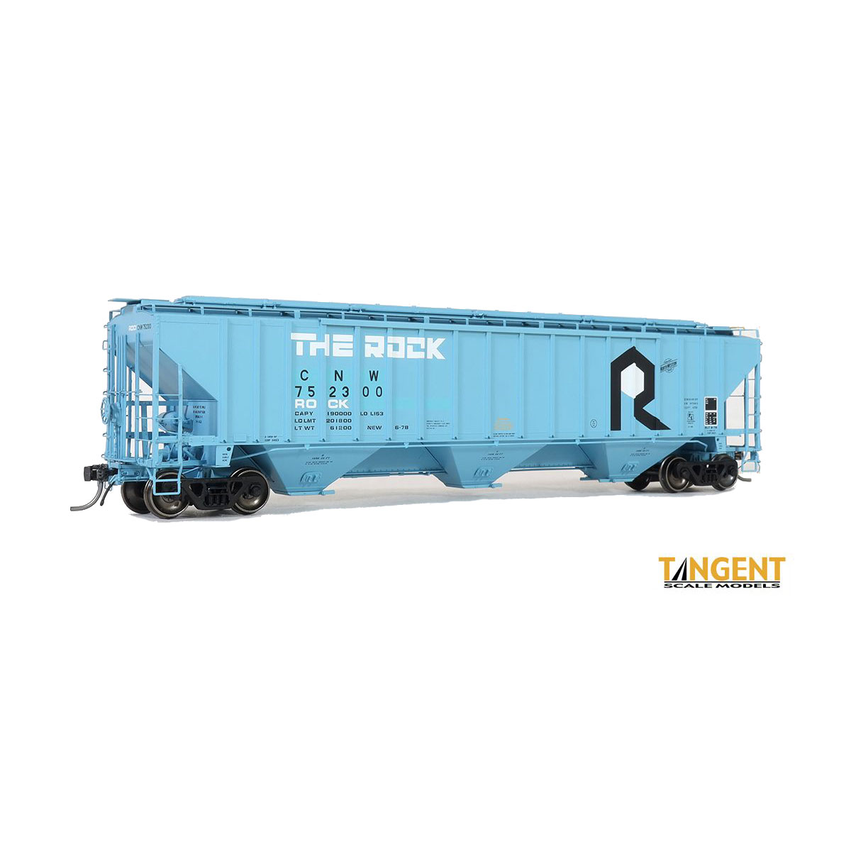 CNW Ex- ROCK “Blue w/ black CNW” V5 is a third “banditized” ROCK scheme variation.  After the ROCK bankruptcy, CNW and other railroads assumed ownership of former ROCK freight cars, including this series of PS4750s.  We have represented some aging of the carbody color with faded blue paint. For this version, the ROCK number has been banditized with fresh blue paint. CNW then added “CNW font” block lettering reporting marks and road numbers, with black lettering. A black CNW herald has been added right next to the large, “R” that remains intact from its ROCK delivery. Also note that we have 2 other paint scheme variants of CNW ex-ROCK cars available as well, since CNW had various “versions” of these banditized cars.