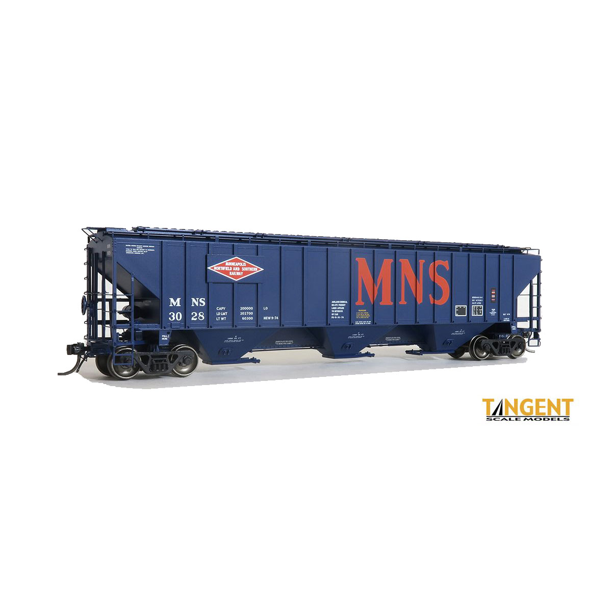 MNS “Original 1974” illustrates the classy dark blue scheme with red diamond logo and large “MNS” lettering on the side of the car. The red diamond logo bearing the words “Minneapolis Northfield and Southern Railway” has a white, diamond shape border around it just like the real placard had! The model also has the reporting mark and number on the coupler box on the right side, matching the prototype car.