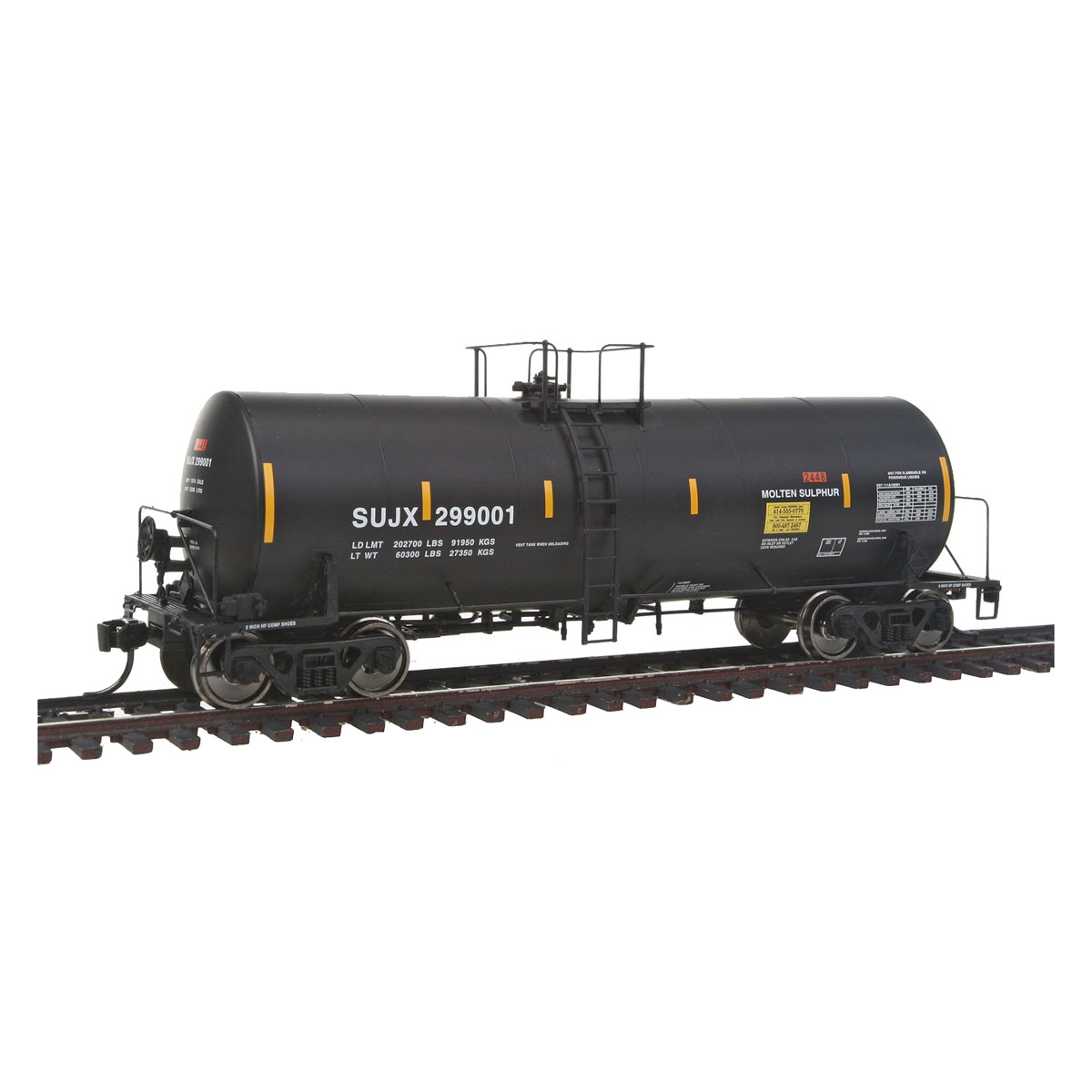 Walthers Proto HO 40′ Trinity 14,000 Gallon Molten Sulfur Tank Car Sulcom Inc. “SUJX, Conspicuity Stripes”