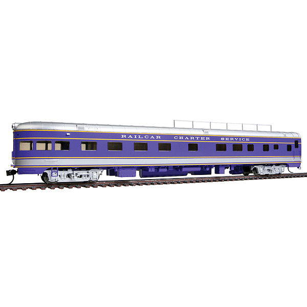 A special version of the Budd 1 Drawing Room, 29-Seat Lounge (#920-11900) features a real metal finish to simulate stainless steel, but is partially cleaned and partially tarnished to simulate a car undergoing restoration. Finished in a custom purple and silver scheme, the Railcar Charter Service 85′ Pullman-Standard Club Lounge (#920-11902 Lighted or #920-11901 Non-lighted), and Charter Service 85′ 6-4-1 Observation Lounge (#920-11902 Lighted or #920-12902 Non-Lighted) are typical of restored cars, available for tours and fan trips over any railroad, including yours!