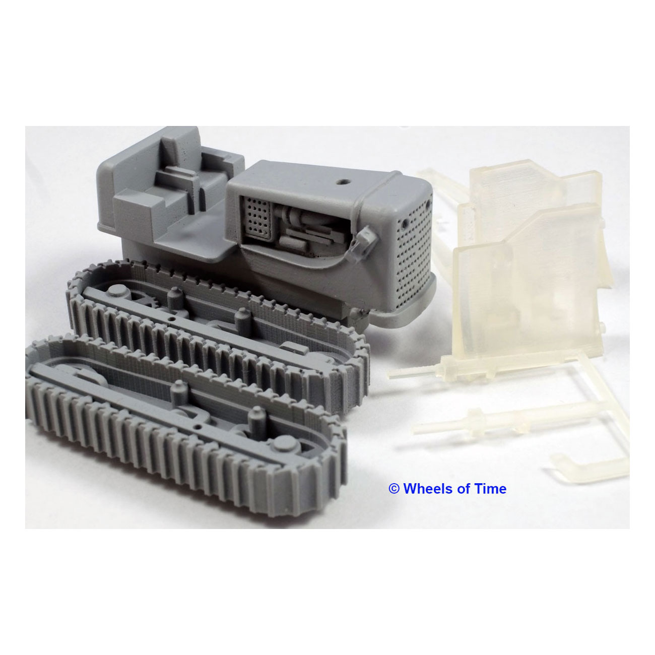 HD-21 Dozer Kit consists of body, right side and left side treads. Made of high quality urethane resin casting in neutral gray. Highly detailed two-piece blade (for easy installation) on tractor, exhaust pipe and hydraulic cylinders in 3D printed acrylic.